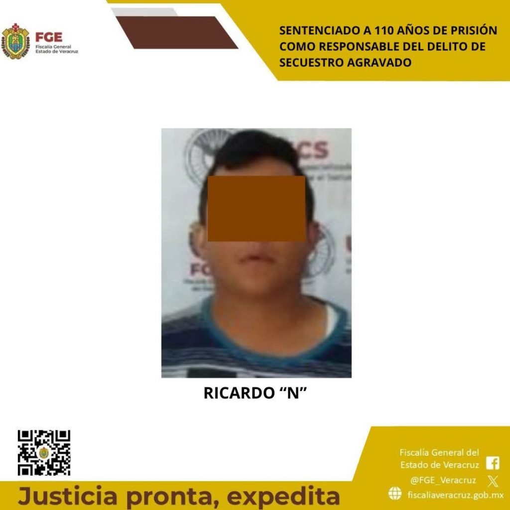 Veracruz.- La Fiscalía General del Estado de Veracruz informó la obtención de una sentencia condenatoria de 110 años de prisión en contra de Ricardo “N”, tras ser encontrado responsable del delito de secuestro agravado, en un caso que refuerza las acciones institucionales contra este tipo de ilícitos en la entidad.