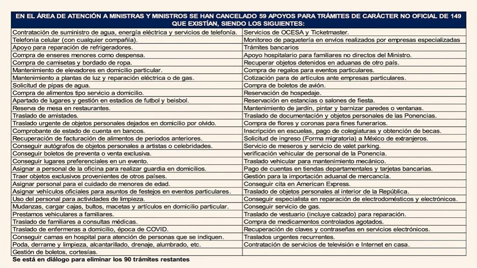 La presidenta también dio a conocer la cancelación de 59 trámites extraordinarios que anteriormente podían solicitar los ministros, como apoyos para reparación de electrodomésticos, compra de despensa, suministro de pipas de agua, gestión de boletos en estadios, reservaciones en restaurantes, obtención de autógrafos y objetos personales de celebridades, además de la asignación de personal para guardias en domicilios, labores de limpieza y cuidado de menores de edad.