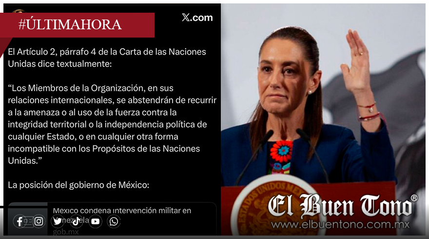 La presidenta de México, Claudia Sheinbaum Pardo, condenó de manera firme la intervención militar de Estados Unidos en Venezuela y subrayó que el uso de la fuerza está prohibido por el derecho internacional, al citar de forma textual el Artículo 2, párrafo 4, de la Carta de las Naciones Unidas.