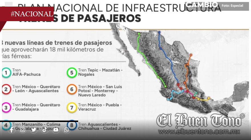 Sheinbaum explicó que durante el gobierno de Andrés Manuel López Obrador se construyeron más de mil 500 kilómetros de vías para trenes de pasajeros, incluyendo proyectos como el Tren Maya, el Interoceánico (carga y pasajeros) y las conexiones México-Nuevo Laredo, México-Nogales y México-Pachuca.