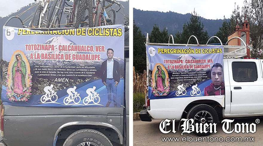 Calcahualco.- A seis meses de la desaparición de dos hombres, uno originario de Totozinapa y otro de Santa María Chilchotla, estado de Oaxaca, sus familiares continúan con las esperanzas de volver a encontrarlos, por lo que ayer en la peregrinación de ciclistas que partió hacia la Basílica de Guadalupe, mostraron lonas con sus rostros y en las que llevan sus oraciones para dar con su paradero.