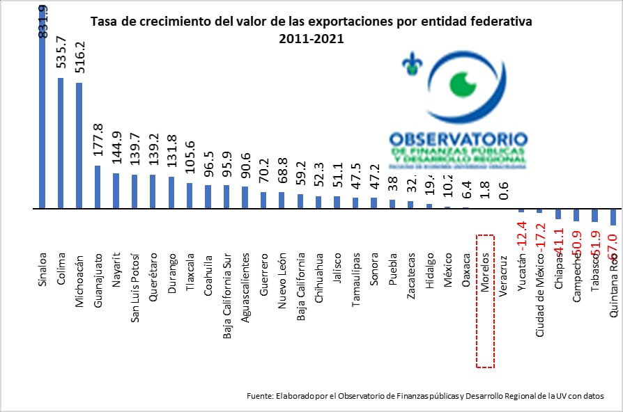 Explicó que apenas se recuperó el nivel que se tenía antes del inicio de la pandemia. Con este reducido crecimiento, Veracruz ocupa el último lugar entre los 23 estados me registraron crecimiento en este período, superado de manera muy amplia por otros como Tabasco cuyas exportaciones crecieron 29 por ciento, Oaxaca 48.9, Zacatecas 48.5, Colima 32.5 y Tlaxcala con 32 por ciento.