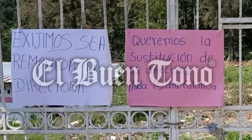 A pesar de la suspensión de clases de este viernes, los padres de familia mantienen el plantel tomado con cartulinas pegadas en el portón dónde expusieron la inconformidad de la permanencia de la directora.