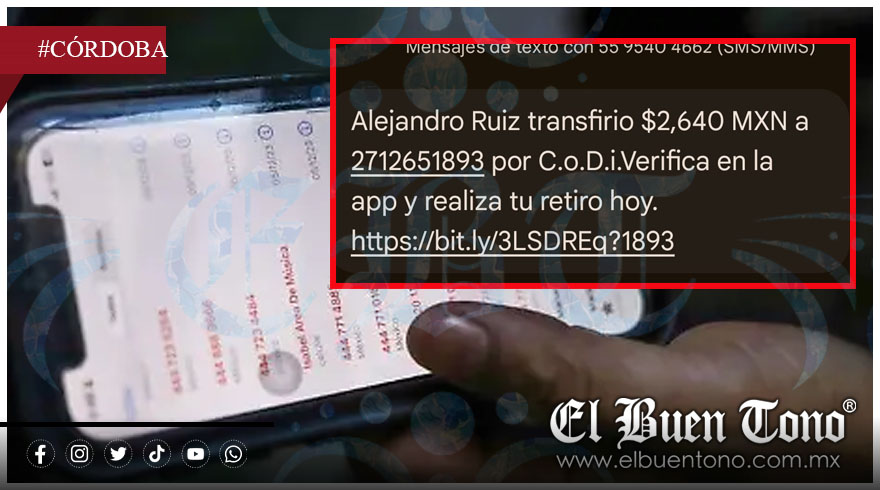 Córdoba, Ver.- Las modalidades de extorsión continúan proliferando a través de llamadas telefónicas y mensajes SMS enviados desde distintos puntos del país, incluidos números de otros estados. En estos intentos de fraude, los delincuentes simulan transferencias bancarias mediante mensajes que aparentan ser notificaciones oficiales, como el que señala que “Alejandro Ruiz transfirió 2 mil 640 pesos” e invita al destinatario a ingresar a un enlace para verificar el supuesto depósito.