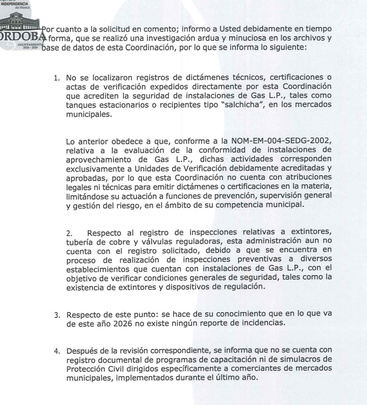 En cuanto a los dictámenes técnicos sobre instalaciones de gas, la respuesta fue contundente: “No se localizaron registros de dictámenes técnicos, certificaciones o actas de verificación expedidos directamente por esta Coordinación que acrediten la seguridad de instalaciones de Gas L.P., tales como tanques estacionarios o recipientes tipo ‘salchicha’, en los mercados municipales”.