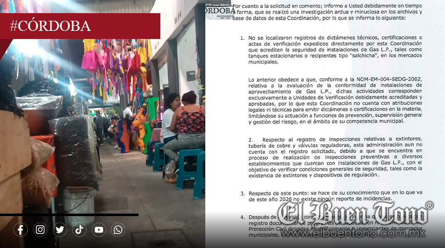 En cuanto a los dictámenes técnicos sobre instalaciones de gas, la respuesta fue contundente: “No se localizaron registros de dictámenes técnicos, certificaciones o actas de verificación expedidos directamente por esta Coordinación que acrediten la seguridad de instalaciones de Gas L.P., tales como tanques estacionarios o recipientes tipo ‘salchicha’, en los mercados municipales”.