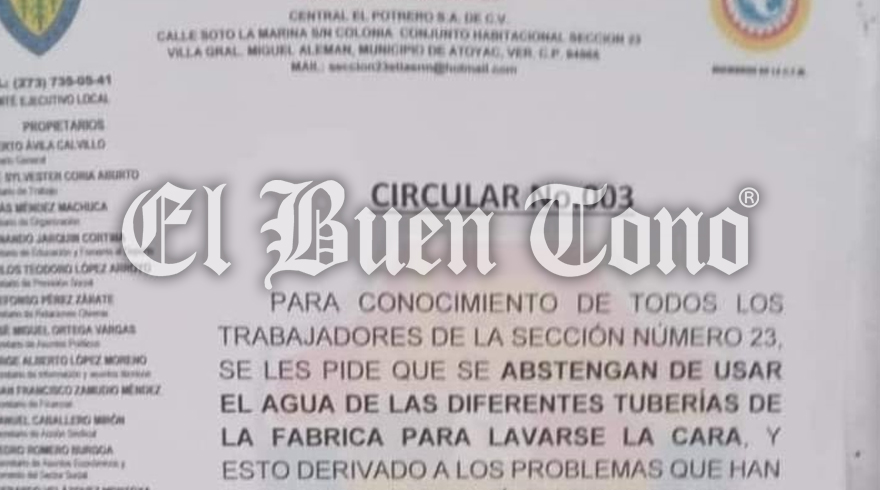Atoyac.- La Sección 23 del Sindicato de Trabajadores de la Industria Azucarera y Similares de la República Mexicana (STIASRM) exhorta a los obreros del ingenio Central El Potrero a no utilizar el agua de la fábricak debido a que algunos han presentado infecciones oculares y dermatológicas.
