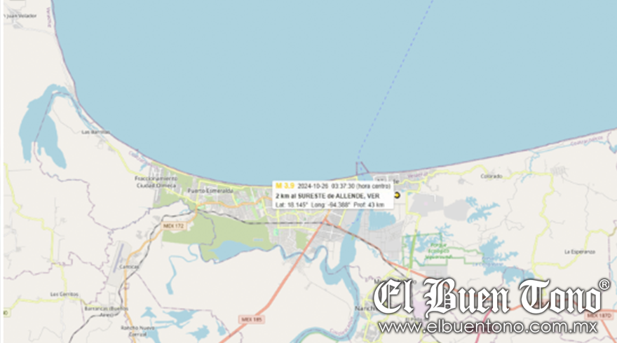 Veracruz.- La madrugada de este sábado, un sismo de magnitud 3.9 se registró al sur de Veracruz, según el Servicio Sismológico Nacional (SSN). El epicentro fue localizado a 2 kilómetros al sureste de Allende, en la región cercana a Coatzacoalcos, y ocurrió a las 03:37 horas con una profundidad de 43 kilómetros.