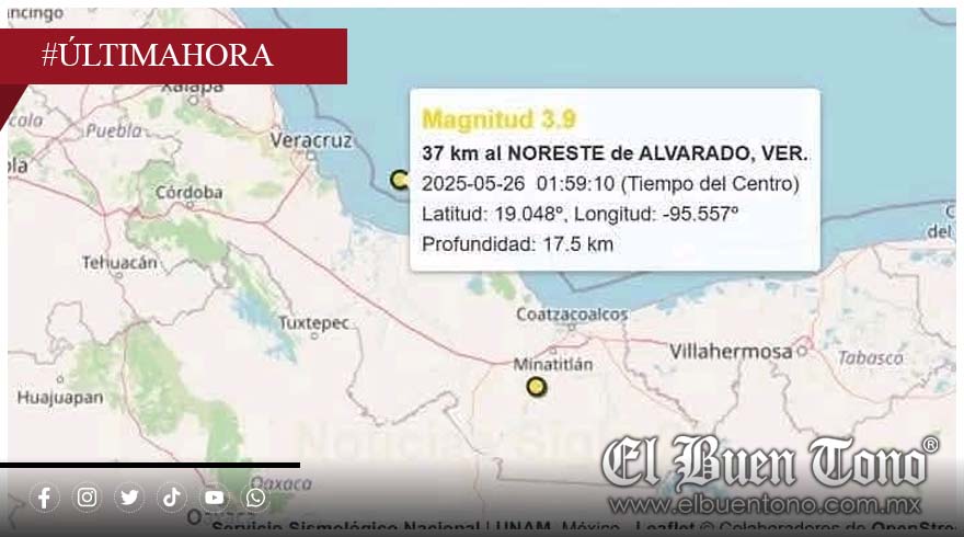 Alvarado, Veracruz — Un sismo de magnitud 3.9 fue registrado en las primeras horas de este lunes frente a las costas del municipio de Alvarado, según informó el Servicio Sismológico Nacional (SSN).