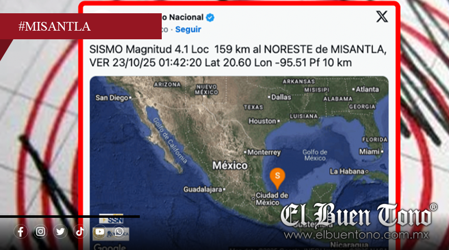 “@SSNMexico SISMO Magnitud 4.1 Loc 159 km al NORESTE de MISANTLA, VER 23/10/25 01:42:20 Lat 20.60 Lon -95.51 Pf 10 km”.