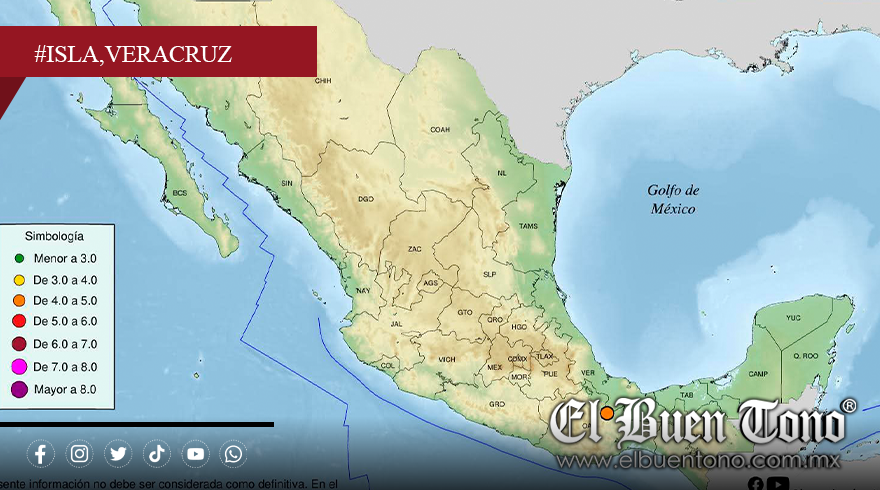 Un sismo de magnitud 4.1 sacudió este viernes la región sureste de Veracruz, con epicentro ubicado a 71 kilómetros al suroeste de Isla, según reportó el Servicio Sismológico Nacional (SSN). El movimiento ocurrió a las 14:50 horas, con una profundidad de 101.5 kilómetros y coordenadas 17.462º de latitud y -95.844º de longitud.