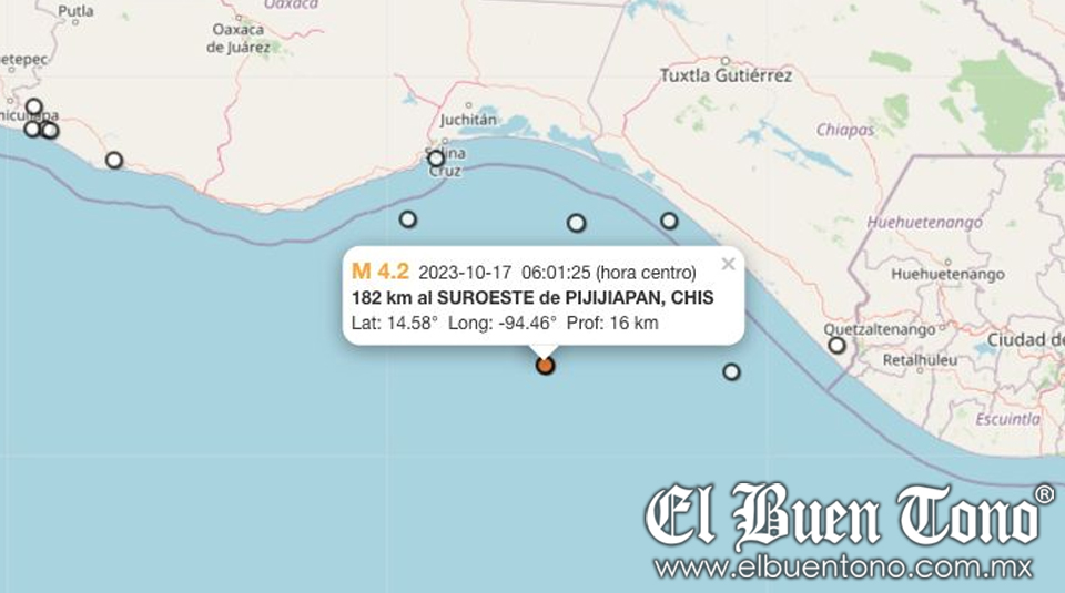 El SSN reportó un sismo a las 06:01 horas a 182 kilómetros al suroeste de Pijijiapan, Chiapas; el temblor fue de magnitud 4.2 y se produjo a 16 kilómetros de profundidad.