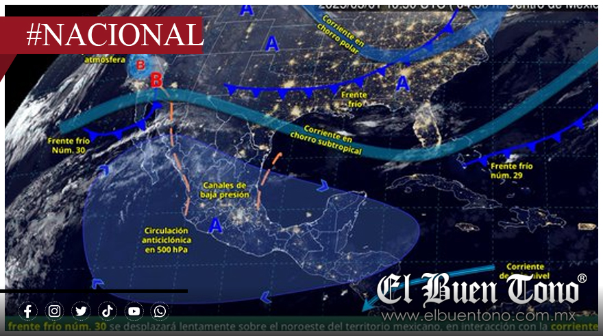 Nacional.- El Servicio Meteorológico Nacional (SMN) informó sobre la llegada del frente frío número 30, que avanza lentamente sobre el noroeste de México. Su interacción con la corriente en chorro subtropical y una circulación ciclónica en niveles altos de la atmósfera provocará un marcado descenso de temperatura, fuertes vientos y lluvias en distintas zonas del país durante el fin de semana.