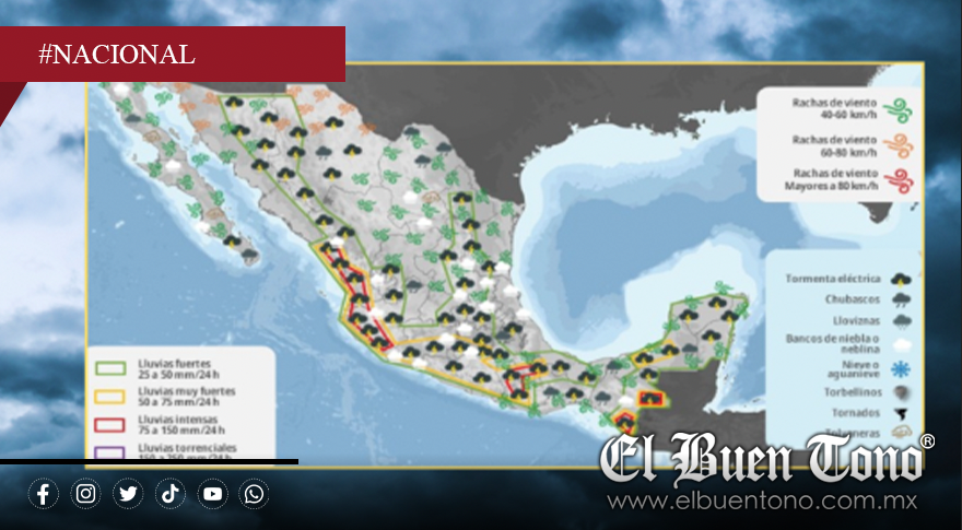 En el norte de Chihuahua y el noroeste de Coahuila, se mantiene la posibilidad de torbellinos o tornados, mientras que las lluvias podrían elevar los niveles de ríos y arroyos, generar deslaves e inundaciones en zonas montañosas y afectar carreteras del sur y sureste del país.