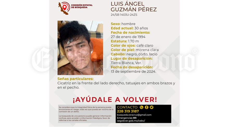 Tierra Blanca, Ver.- Un individuo identificado como Luis Guzmán Pérez, de 30 años de edad, es buscado por su familia ya que desde el pasado 14 de septiembre no saben nada sobre su paradero.