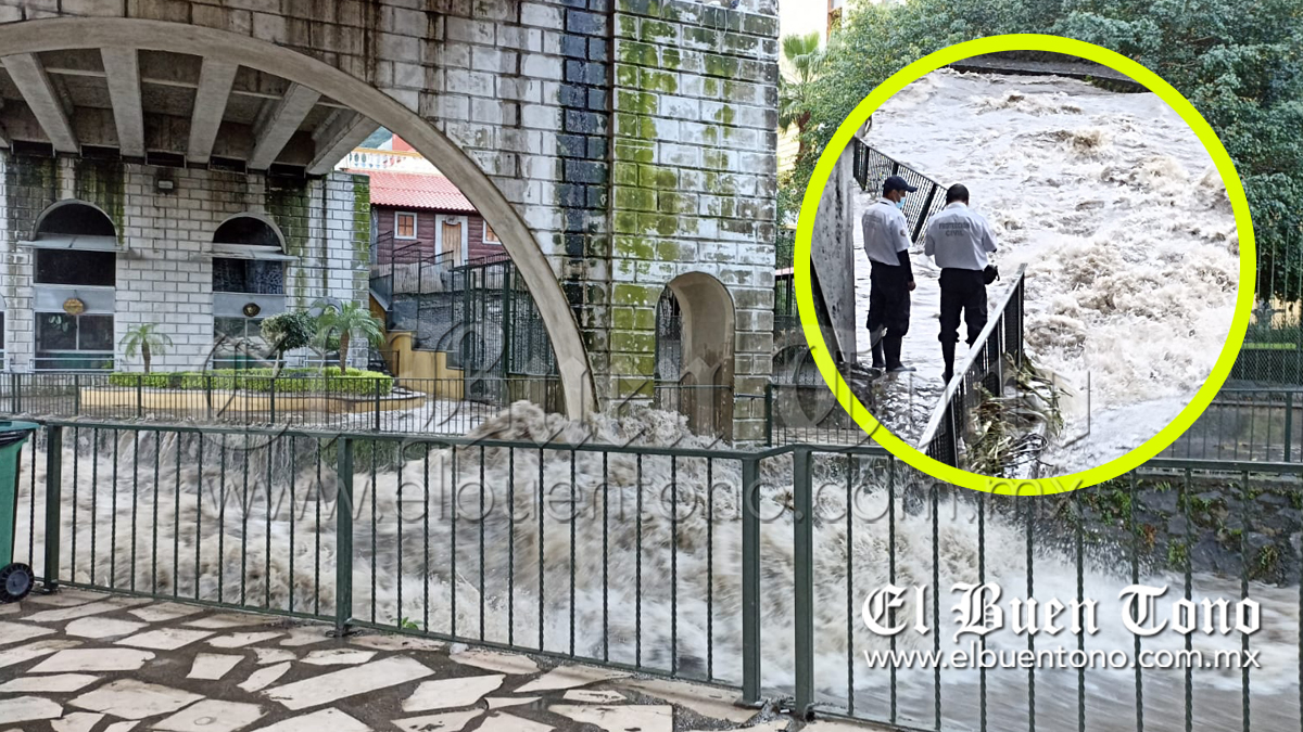 Orizaba. – Suben los niveles de Río Orizaba de manera alarmante debido a la fuerte lluvia que se registró en la zona alta de las faldas del Pico Orizaba, el agua llegó al nivel de la banqueta de la jaula del Mono Araña que se encuentra a la altura del teleférico.