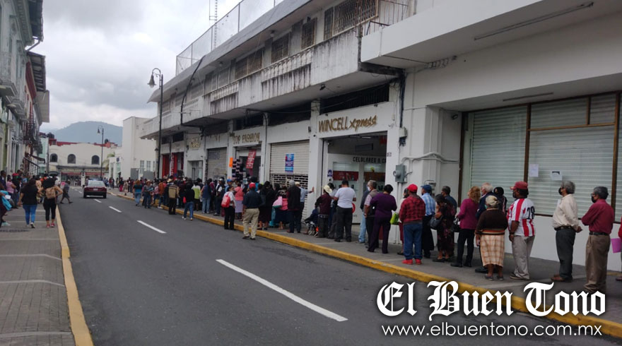 ORIZABA.- Adultos mayores, algunos de ellos que padecen una discapacidad y con problemas urinarios pasan horas bajo las inclemencias del tiempo, como la lluvia, para poder cobrar su pensión, los bancos del Bienestar no han servido de mucho para resolver la problemática.