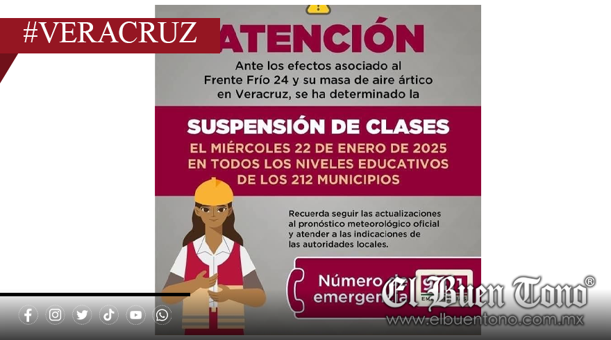 Orizaba.- Por los efectos del frente frío número 24 y su masa de aire ártico, el Gobierno del Estado de Veracruz, a través de las secretarías de Educación y de Protección Civil, anunció la suspensión de clases para este miércoles 22 de enero en todos los niveles educativos de los 212 municipios de la entidad.