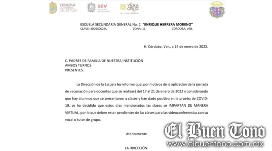 CÓRDOBA.- La escuela Secundaria General 1 suspendió las clases presenciales del 17 al 21 de enero luego de que alumnos dieran positivo a la prueba de Covid-19, por lo que las clases se impartirán de manera virtual. Lo anterior se dio a conocer luego de un aviso por parte de los directivos de la antes mencionada institución dirigido a los padres de familia, en dicho documento también se mencionaba que la suspención se debía a la aplicación de la jornada de vacunación para los docentes. Las mismas medidas para evitar la propagación de contagios fueron tomadas en la ESBAO, no obstante, en otros planteles escolares continúan con el sistema híbrido y escalonado.