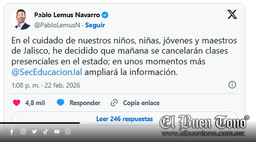 Jalisco.- Derivado de los recientes hechos de violencia registrados en la entidad y tras la muerte de Nemesio Oseguera Cervantes, alias “El Mencho”, el gobernador de Jalisco, Pablo Lemus, anunció la suspensión de clases presenciales en todo el estado para este lunes 23 de febrero.