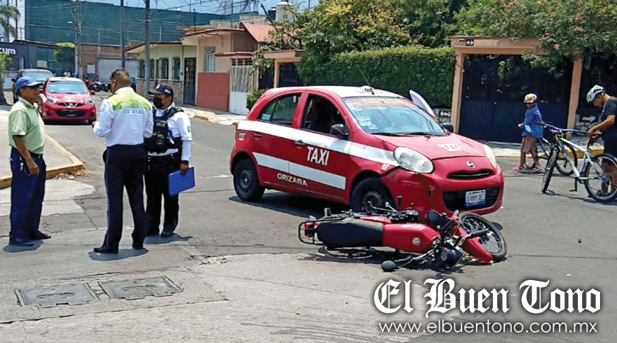 Orizaba.- Un matrimonio resultó lesionado, luego de que fuera arrollado por el conductor de un taxi que se pasó la preferencia y los embistió, cuando circulaban a bordo de su motocicleta por calles de la colonia Emiliano Zapata.