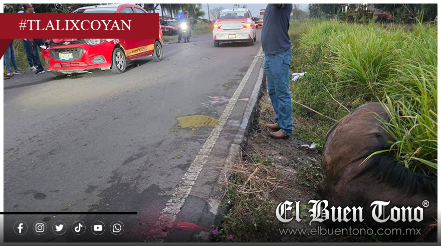 Tlalixcoyan, Ver.— Un taxi chocó contra un caballo que se encontraba suelto sobre la carretera Tlalixcoyan–La Laguna, la mañana de este viernes, lo que dejó como saldo la muerte del animal, una persona lesionada y daños materiales en la unidad.