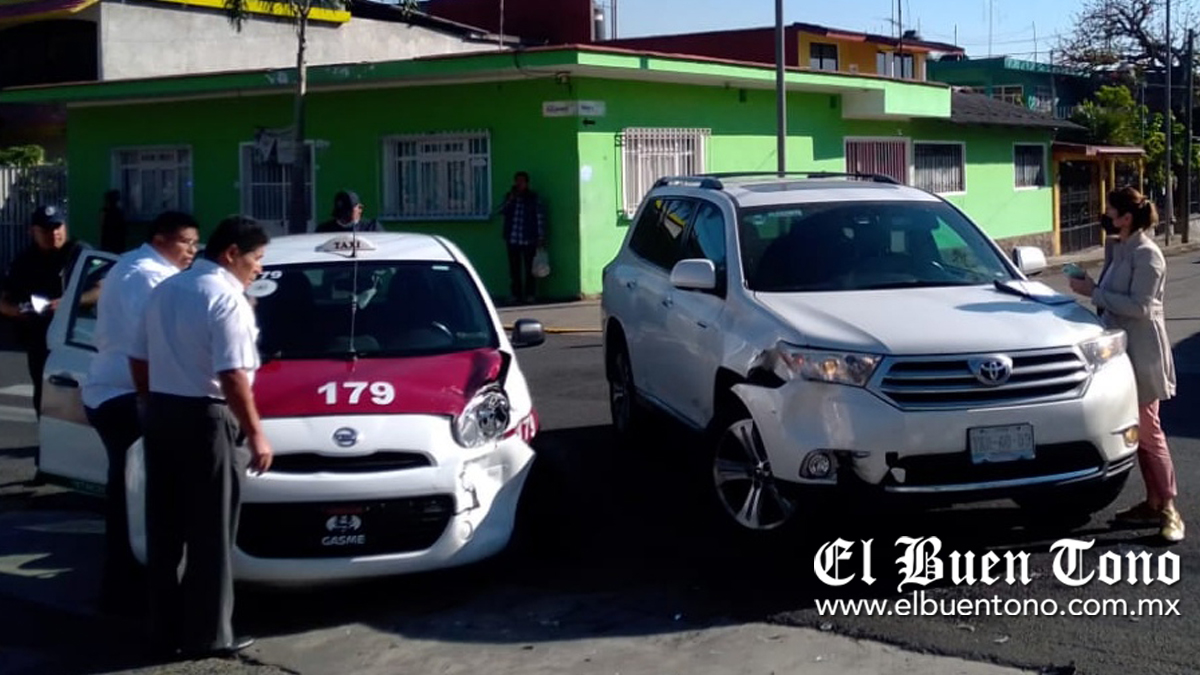 Al llegar al cruce con calle Poniente 3, la unidad fue embestida sobre su costado derecho por el taxi No. 179, cuyo chofer no respetó el 1×1 y provocó la colisión, quedando lesionada la persona que viajaba de pasajero en el carro de renta.