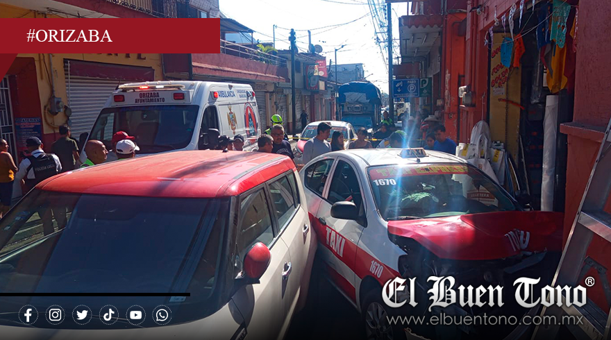 Orizaba, Ver.- Un taxi terminó impactado contra la fachada de una tienda y un automóvil estacionado, en el cruce de Oriente 5 con Norte 2 y 4, provocando daños materiales considerables y la movilización de los cuerpos de emergencia.