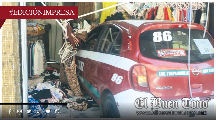 El automóvil de alquiler, color blanco con rojo y franja verde, con número económico 86 de Tuxpanguillo, municipio de Ixtaczoquitlán, perdió el control debido al exceso de velocidad, se subió a la banqueta y se incrustó en un local de venta de ropa.