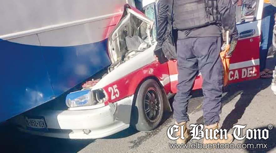 Huatusco.- La unidad de alquiler número 25 de Comapa se impactó contra un autobús número 42 de la línea Azules, durante la mañana de ayer, sábado, a la altura del lugar conocido como Agua Santa, en la comunidad Dos Cruces, entre Comapa y Totutla, dejando a una persona lesionada.Paramédicos del Grupo Samuv arribaron al lugar para brindarle los primeros auxilios al taxista Téodulo Cano y valorar su estado de salud.Este accidente se registró cuando el taxista probablemente no guardó la distancia correspondiente y se impactó contra el autobús.A través del número de Emergencias 911, se alertó al personal de los diferentes grupos de auxilio y a las autoridadespoliciacas.Elementos policiacos municipales y estatales llegaron para tomar conocimiento y realizar el deslinde de responsabilidades, así como para ordenar el retiro de las unidades.