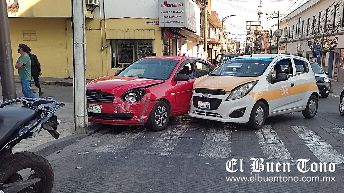 El percance se registró en la colonia Centro, cuando el taxista circulaba sobre la calle 8, al llegar a la avenida 1, impactó al vehículo particular, saliendo los dos proyectados hacia la banqueta.