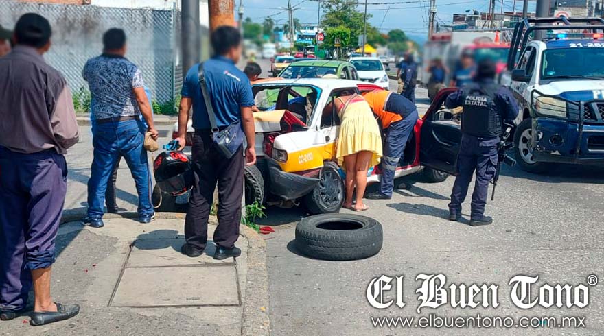 Al momento, el taxi fue impactado y proyectado en reversa hacia una talachera, quedando lesionada la pasajera del vehículo de alquiler.