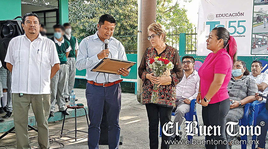 El director, Edgar Javier Rosas Gaspar y autoridades municipales, entregaron un reconocimiento a la profesora, quien recibió una ovación.