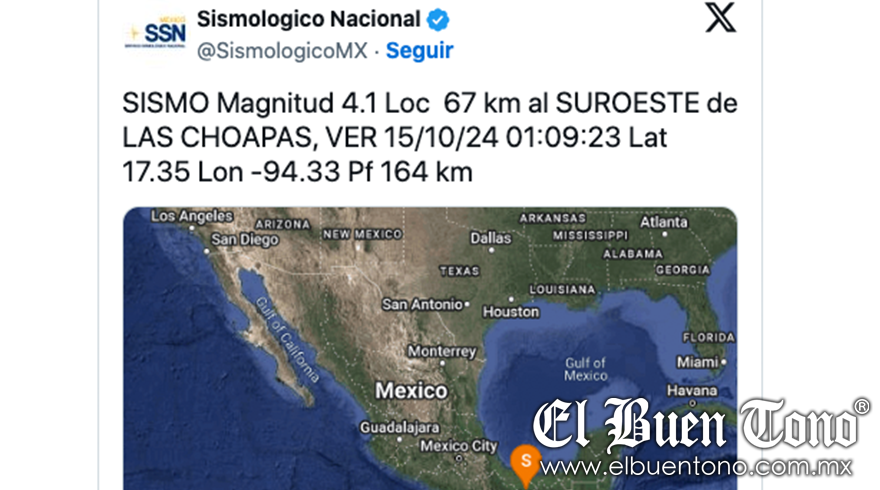 Veracruz.- Un sismo de magnitud 4.1 se registró en Las Choapas, Veracruz, a las 01:09 horas del 15 de octubre de 2024, según el Servicio Sismológico Nacional (SSN).