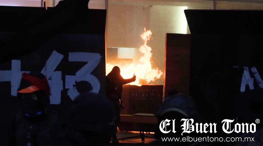 A partir de las 17:00 horas, la manifestación avanzaba con consignas como “¡Ayotzi vive!” y “¡Fue el Estado!”, pero los momentos más álgidos surgieron cuando un grupo reducido de jóvenes, vestidos de negro y con el rostro cubierto, comenzaron a realizar pintas con mensajes como “Fue el Ejército” y “Palestina Libre” en los muros de negocios y edificios sobre Paseo de la Reforma. Armados con mazos y martillos, también rompieron vidrios y prendieron fuego a varios locales comerciales, entre ellos una sucursal de Starbucks, un Sonora Grill y una tienda de ropa Aldo Conti.