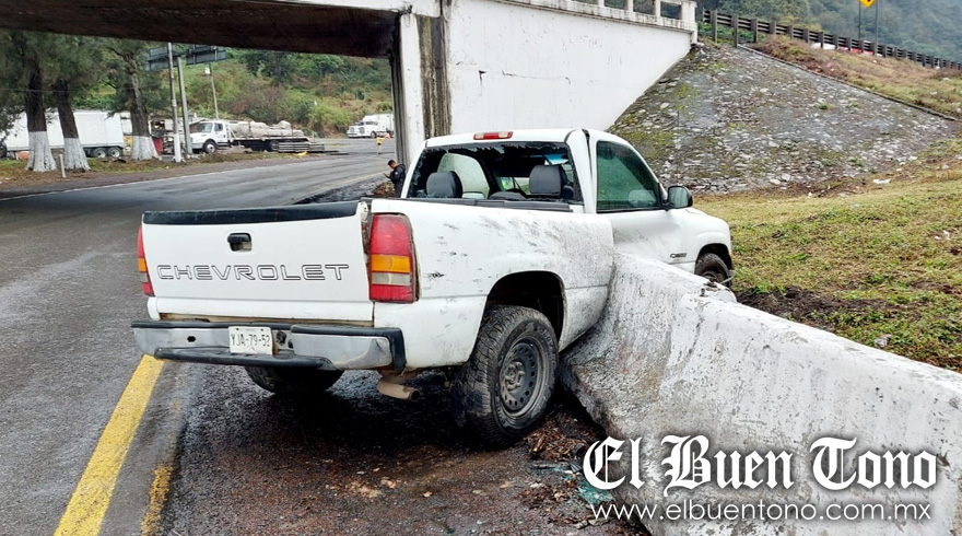 El percance ocurrió cuando un hombre viajaba a bordo de una Chevrolet F-150 de color blanco de batea, con placas YJA-79-63 del estado de Veracruz, sobre el carril de descenso de la citada vía rápida. Al tomar la curva que está a la altura del kilómetro 268, el automovilista perdió el control y, luego de derrapar sobre el piso mojado, la camioneta chocó contra el muro de concreto lateral, aunque por fortuna el hombre salió ileso.