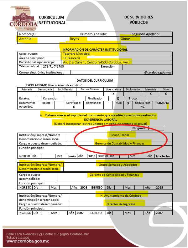 Reyes Olmos no solo es pieza clave para controlar las finanzas municipales. También es militante activa del PAN desde 2012 y hermana del contralor de la administración anterior que “no cobró un solo peso de lo robado en el ayuntamiento”. El expediente laboral de la tesorera la muestra como subordinada directa de Luis Abella en Grupo Trabal y de Víctor Serralde, empresario acusado de cobrar a ayuntamientos panistas por servicios no prestados.