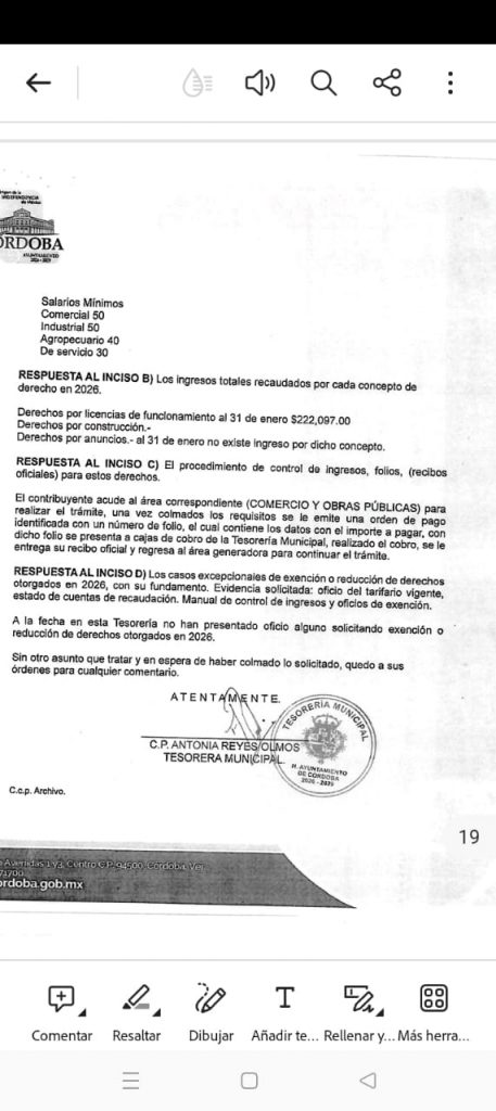 Córdoba, Ver.- La Tesorería Municipal reportó en enero de 2026 ingresos por $222,097.00 por concepto de derechos de licencias de funcionamiento, el Censo Nacional de Gobiernos Municipales 2025 (con datos de 2024) registró apenas 1,224 trámites de apertura y 1,118 bajas, con cero trámites distintos a apertura y baja.