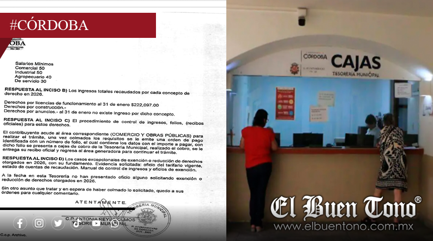 Córdoba, Ver.- La Tesorería Municipal reportó en enero de 2026 ingresos por $222,097.00 por concepto de derechos de licencias de funcionamiento, el Censo Nacional de Gobiernos Municipales 2025 (con datos de 2024) registró apenas 1,224 trámites de apertura y 1,118 bajas, con cero trámites distintos a apertura y baja.