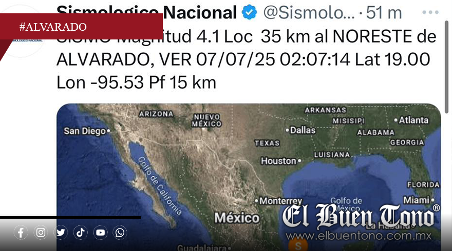 Veracruz.- Durante la madrugada de este 7 de julio, un sismo de magnitud 4.1 sacudió el municipio de Alvarado, Veracruz, sorprendiendo a los habitantes mientras dormían.