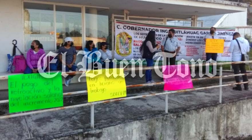 Con múltiples cartulinas sostenidas por los integrantes del citado sindicato y otras más pegadas a la fachada del inmueble, exigen el pago del retroactivo y nivelación salarial del incremento 2022, la publicación de la convocatoria para la promoción horizontal en Veracruz, así como los pagos puntuales en horarios de trabajo entre otras.
