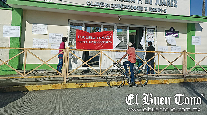 Con cartulinas “exigimos docentes completos para todos los grados, en ambos turnos; Matemáticas, Artes, Formación Cívica, Biología”; y lonas en color rojo y con la leyenda “escuela tomada por falta de docentes”, los padres inconformes pretendían no permitir el acceso a los estudiantes.