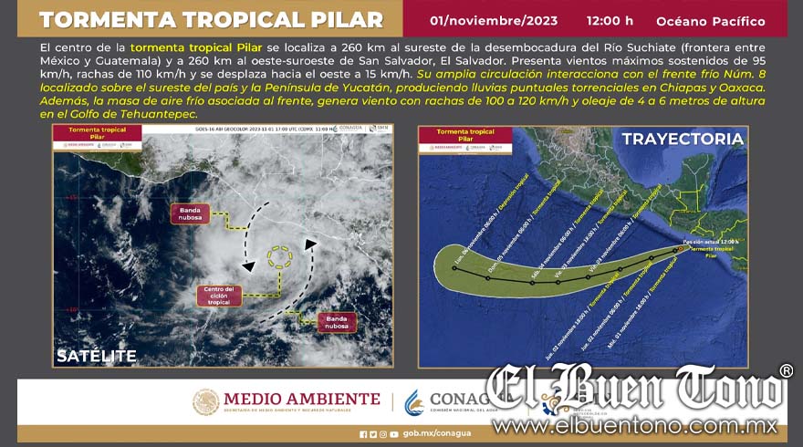 Según el SMN, “Pilar” se ubica a 260 kilómetros al sureste de la desembocadura del Río Suchiate, que marca la frontera entre México y Guatemala, y a 260 kilómetros al oeste-suroeste de San Salvador, El Salvador. Esta tormenta tropical se mantiene en la región, lo que provoca lluvias torrenciales en Chiapas y Oaxaca. Además, se ha anunciado que la masa de aire frío asociada al frente frío número 8 generará vientos con rachas de 100 a 120 km/h y un oleaje de cuatro a seis metros de altura en el Golfo de Tehuantepec.
