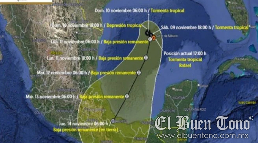 Nacional.- Este sábado, el ciclón Rafael se debilitó a tormenta tropical luego de haber atravesado Cuba como un huracán de categoría 3. Actualmente, se encuentra a 470 kilómetros al nornoroeste de Progreso, México, con vientos máximos sostenidos de 85 kilómetros por hora (km/h) y avanzando hacia el oeste-noroeste a 9 km/h, de acuerdo con el Centro Nacional de Huracanes en Miami. Se espera que la tormenta se disipe en el Golfo de México en los próximos días mientras se desplaza hacia el sur de México.
