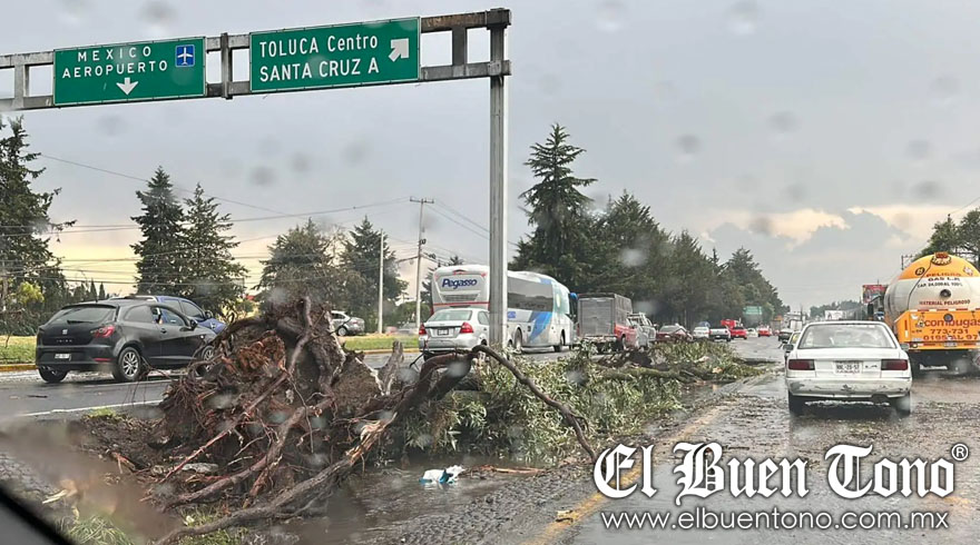 Toluca.- Esta tarde, la capital mexiquense sufrió los embates de una fuerte lluvia y granizada acompañada de vientos, provocando la caída de árboles y daños en infraestructura al norte de Toluca. Según reportes, al menos tres árboles fueron derribados en la carretera Toluca-Palmillas, en dirección a la zona norte del Estado de México, generando un considerable asentamiento vehicular. Los automovilistas han reportado estas incidencias a las autoridades, quienes ya trabajan en la zona para restablecer la normalidad.