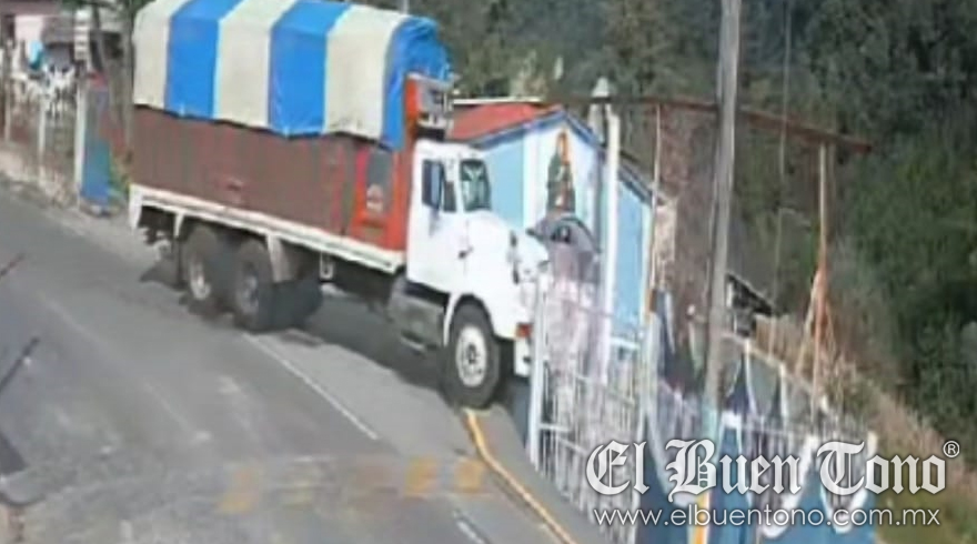 Coscomatepec, Ver.- Un camión tipo Tortón chocó contra la capilla de la comunidad de Manzanatitla, esta mañana de domingo, estando a punto de provocar una tragedia.