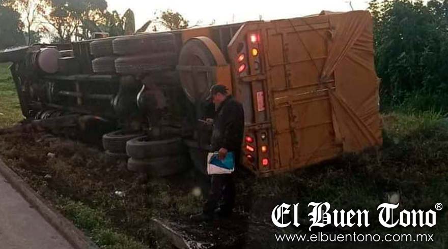 Amatlán.- Un camión tipo torton volcó a un costado de la autopista Córdoba-Veracruz, después de que el conductor perdiera el control y se saliera de la vialidad a la altura de Rancho Trejo.