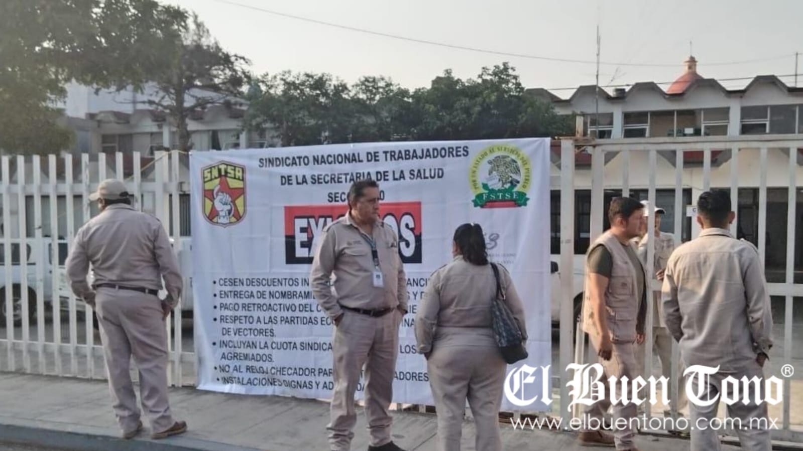 A la entrada de la dependencia de salud, ubicada en la avenida Cristóbal Colón entre Sur 23 y 25 en la colonia Barrio La Concordia, los manifestantes colocaron una lona con sus demandas, que incluyen el cese de descuentos indebidos por parte de casas financieras, la entrega de nombramientos provisionales y definitivos, y el pago retroactivo del concepto 30 por alto riesgo.