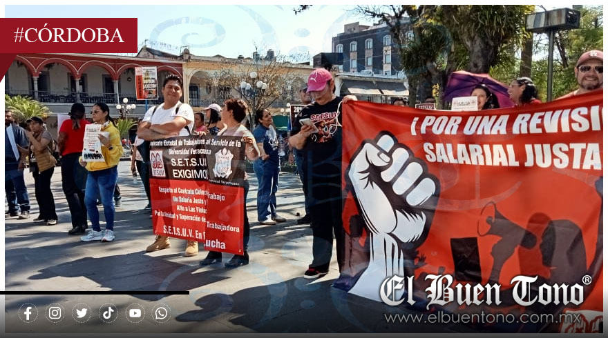 Córdoba, Ver.- Trabajadores sindicalizados adheridos al Sindicato Estatal de Trabajadores al Servicio de la Universidad Veracruzana (SETSUV) se manifestaron la mañana de este jueves en la Plaza de Armas del parque 21 de Mayo, en el centro de Córdoba, para exigir a las autoridades universitarias un aumento salarial del 20%.