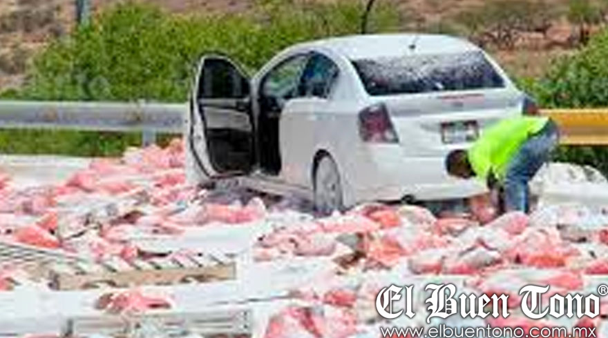 Chihuahua.- Un tractocamión que transportaba al menos 30 toneladas de yeso volcó, causando que la carga cayera sobre un vehículo Nissan Sentra que circulaba por la zona. Afortunadamente, no se reportaron personas lesionadas, solo daños materiales.